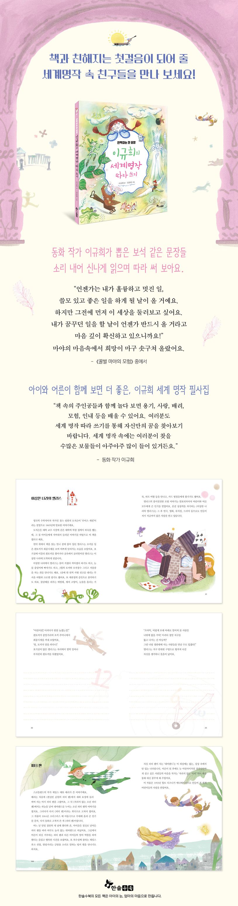 《이규희의 세계 명작 따라 쓰기》는 어린이들이 세계 명작을 만날 수 있는 마중물과 같은 책이라 할 수 있어요. 활발하게 작품 활동을 하고 있는 동화 작가 이규희가 오랫동안 전 세계 어린이들에게 감동을 안겨 준 세계 명작 중에서 30편을 엄선했어요.