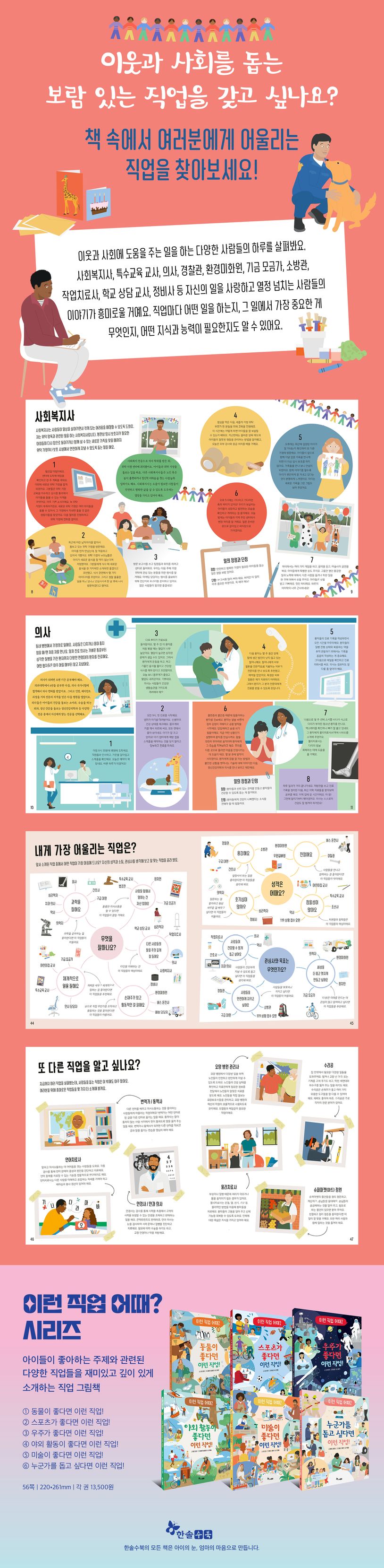 『누군가를 돕고 싶다면 이런 직업!』을 통해 이웃과 사회에 도움을 주는 직업을 가진 사람들의 하루를 살펴봐요. 아픈 사람들을 치료하고 도와주는 의사, 간호사, 작업치료사, 약사부터 질병을 예방하고 치료하는 방법을 연구하는 의학자, 화재를 진압하고 사고 현장에서 사람들을 구조하고 응급 처치를 하는 소방관과 구급 대원, 그리고 기금 모금가, 학교 상담 교사, 사회복지사, 특수교육 교사 등 새롭고 흥미로운 직업까지, 다양한 직업의 세계를 자세히 살펴볼 수 있어요. 직업마다 어떤 일을 하는지, 그 일에서 가장 중요한 게 무엇이고, 어떤 지식과 능력이 필요한지, 직업의 장점과 단점도 알 수 있어요. ‘내게 가장 어울리는 직업은?’ 코너에서는 성격과 소질, 관심사를 토대로 자기에게 잘 맞는 직업이 무엇인지 알아볼 수 있고, ‘또 다른 직업을 알고 싶나요?’ 코너에서는 새로운 직업들을 추가로 살펴볼 수 있어요.