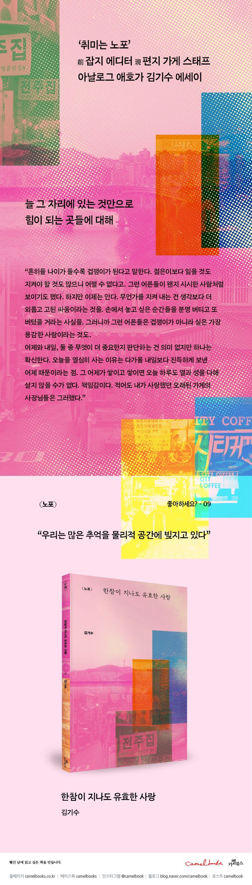 라이프스타일 잡지 〈컨셉진〉의 에디터로 직업 생활을 시작해 지금은 편지 가게에서 일하고 있는 김기수의 첫 에세이 『한참이 지나도 유효한 사랑』이 출간되었다. 종이 잡지와 편지라는 이력에서 어쩐지 아날로그 감성이 풍겨 오는 듯한데 그런 그의 취미는 다름 아닌 노포, 오래된 가게다. 낡은 간판을 그냥 지나치지 못하는 그가 늘 그 자리에 있는 것만으로 힘이 되는 곳에 대해, 과거의 기억으로 현재와 미래를 살아가게 하는 것들에 대해 이야기한다.