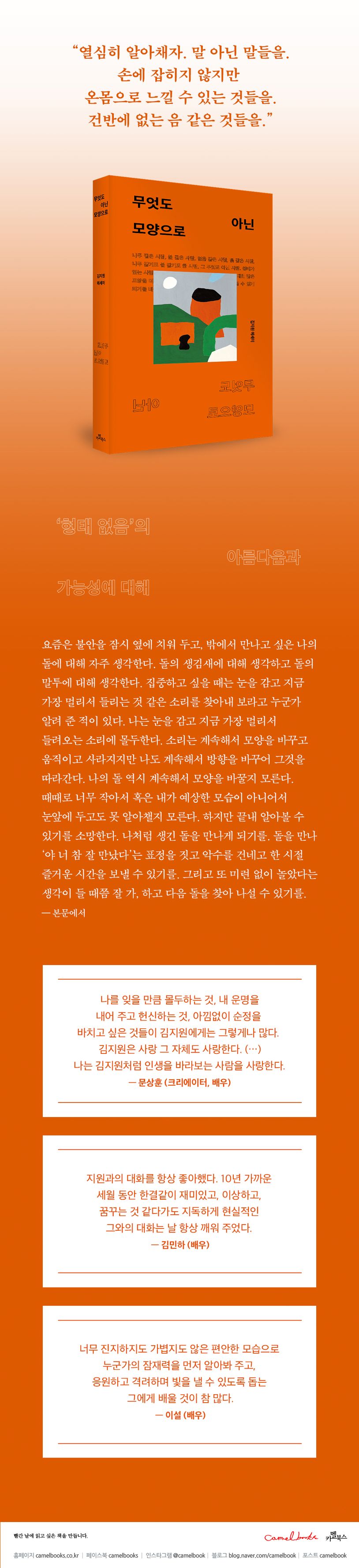 이 책은 스스로를 자주 의심하는 창작자의 자기 탐구 기록이기도 하다. 자신을 창작자로 인정하기까지 긴 시간 많은 경험을 쌓는 과정이 필요했지만, 예술가라는 정체성에 확신을 갖는 일이 더 큰 숙제였다. 프리랜서가 된 이후 불안은 증폭되었다. 그렇게 이리저리 부유하는 마음을 붙잡고 “수많은 꿈에서 돌아오는 길에 쓴 일기 같은 것들”을 『무엇도 아닌 모양으로』에 담았다. 세상이 정한 무엇이 되는 대신 ‘형태 없음’의 아름다움을 발견하고 받아들이겠다는 결심은 무엇도 아닐 수 있는 것들을 소중히 대하는 김지원의 창작 태도와 닮았다. 그는 형태가 없는 것들을 떠올리며 조금씩 불안을 지워 나간다. 파도가 움직이는 모양을 구경하듯. 일렁이는 장작불을 바라보듯. 그렇게 자기 자신과 화해하는 법을 알아 가는 이야기는 모호해서 고유한 각각의 삶에 보내는 선명한 지지와도 같다.