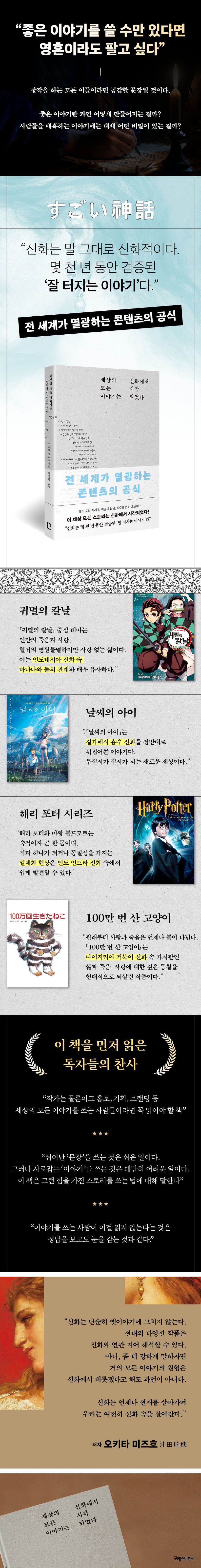 『해리 포터』 시리즈, 「귀멸의 칼날」, 『다빈치 코드』, 『나니아 연대기』… 언뜻 보기에는 아무런 관련이 없어 보이는 이 작품들에는 아주 분명한 공통점이 존재한다. 바로 ‘신화’에 뿌리를 두고 있다는 점이다. 어쩌면 신화라는 옛이야기는 촌스럽고 시대에 뒤떨어진다고 생각할지도 모른다. 그러나 투박한 그 작품 속 주인공들의 목소리를 가만 듣다 보면 어딘지 모르게 익숙함을 느낄 수 있다. 우리가 알고 있는 대부분의 이야기가 바로 수천 년 전부터 살아남은 신화에서 시작되었기 때문이다. 일본에서 지금 가장 주목받는 신화학자 오키타 미즈호의 수작으로 꼽히는 이 책 『세상의 모든 이야기는 신화에서 시작되었다』는 살면서 누구나 한 번쯤 들어봤을 인기 콘텐츠 속의 배경 서사를 탄탄하게 채워주는 신화를 찾아 흥미로운 스토리의 세계로 우리를 이끈다.