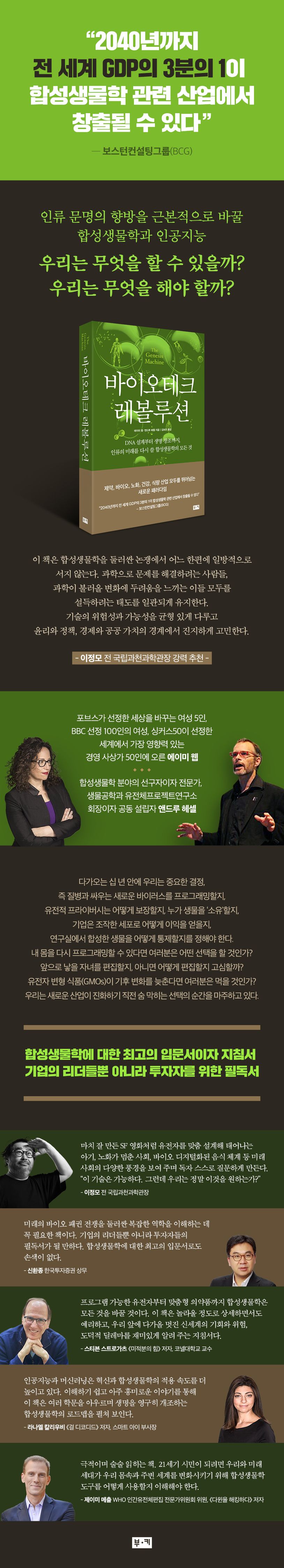 2040년까지 전 세계 GDP의 3분의 1을 차지하면서 바이오산업을 이끌어 갈 합성생물학의 과거, 현재, 미래, 가상 시나리오, 국가 간 패권 전략, 철학과 윤리 등 거의 모든 것을 담았다.