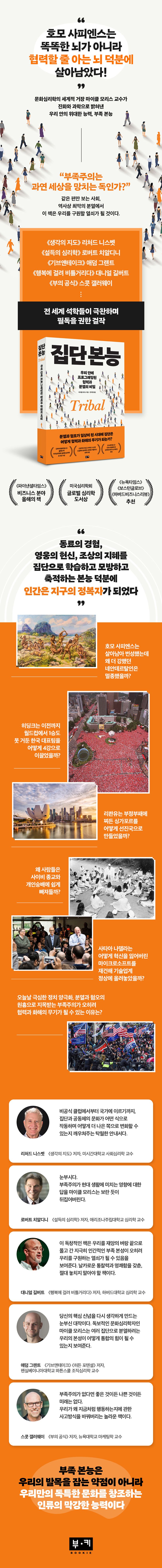 여기서우리가주목해야할무엇보다흥미롭고중요한사실은사람들이흔히분열과혐오의원인이라여기는부족주의,부족본능이사실은화해와협력의무기가된다는점이다.통념과달리부족주의는인류의결함이아니라위대한능력이다.“부족본능은지능적인종을방해하는버그가아니다.부족본능은진화적상승을가능하게만든우리종의특징이며,오늘날에도여러위대한업적을이루게하는원동력이다.우리의발목을잡는약점이아니라우리만의독특한문화를창조하는인류의막강한능력이다.”그런점에서궁극적으로이책은민주주의,기후등오늘날우리가맞닥뜨린위기들을집단의힘으로해결하는법,함께더나은쪽으로변화하는길을안내하는탁월한지침서가되어줄것이다.