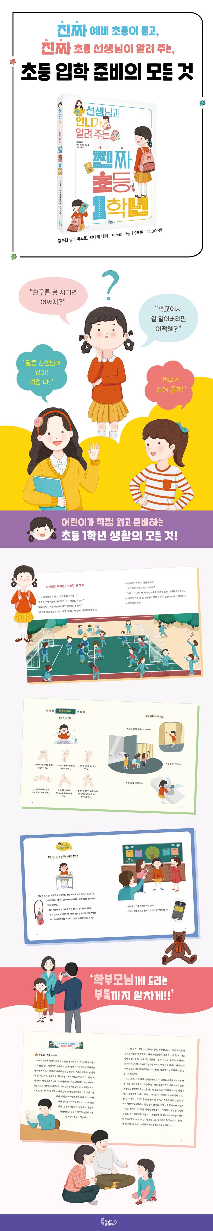 초등학교 입학을 앞두고 학부모님도 고민이 많겠지만, 누구보다 설레고 걱정스러운 건 바로 어린이 본인이겠지요. 그런 어린이들을 위해 실제 초등학교 선생님이 어린이의 궁금증에 하나하나 꼼꼼히 답하며 알려 주는 알찬 초등 1학년 안내서입니다. 어린이 여러분들이 직접 읽고 초등 생활을 하나씩 준비할 수 있도록 도와줄게요!
