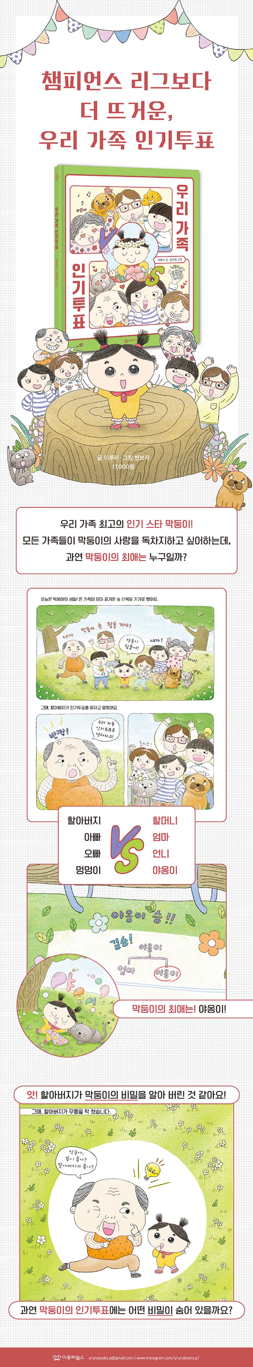 오늘은 막둥이 생일날! 온 가족이 숲으로 산책하러 갑니다. 그런데 가족들이 서로 막둥이랑 손을 잡고 가겠대요! 그러자 할아버지는 인기투표를 하자고 합니다. 과연 막둥이는 누구와 손을 잡을까요? 『우리 가족 인기투표』는 우리에게 가족의 사랑과 행복의 의미를 전하는 그림책입니다!