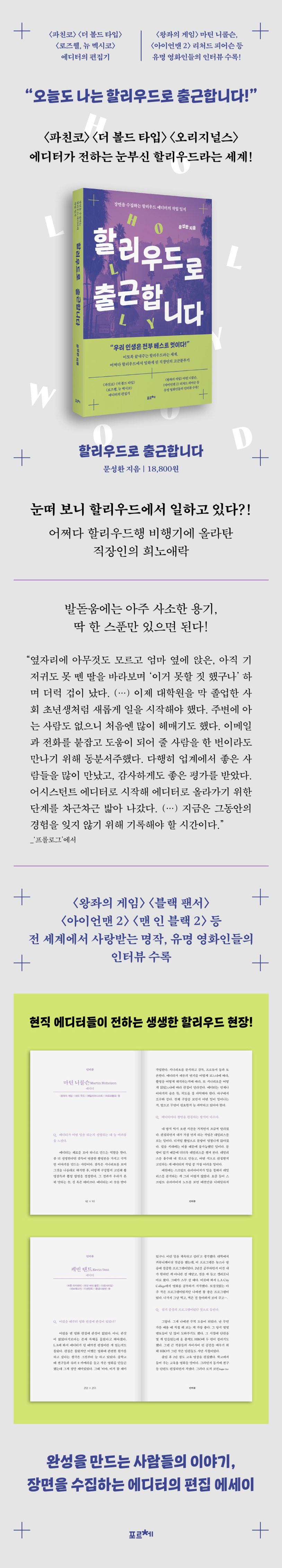 세상은 참 넓다. 우리는 각자 인생의 주인공이 되어 내 삶을 잘 살아내기 위해 고군분투한다. 그렇지만 결국 사람은 본인이 아는 만큼의 조그마한 세상만 바라본다. 그러면서도 각자 삶의 영역을 넓히기 위해 애쓴다. 내가 모르는 이들의 인생은 어떻게 흘러갈까? 《할리우드로 출근합니다》는 에디터인 저자가 전하는 할리우드와 한국 시스템에 대한 기록이다. 할리우드 영화, ‘미드’ 등 막연히 바삐 돌아가면서도 멋지리라 생각한 현장은 생각했던 것만큼 아름답지는 않다. 그곳 역시 사람 사는 곳이며, 누군가의 일터이자, 집이었다. 이 책은 ‘할리우드’라는 꿈의 공간이 어떻게 흘러가는지를 다루고 있다. 아주 가볍지만은 않은 에세이다. 영화와 드라마 편집이라는 우리가 알지 못하는, 할리우드라는 치열한 세계를 엿보기 위한 책이다. 할리우드로 출근하는 이들은 어떤 삶을 살고 있는지, 어떤 다양한 치열함을 겪고 있는지 이 책을 통해 만나보기를 바란다.