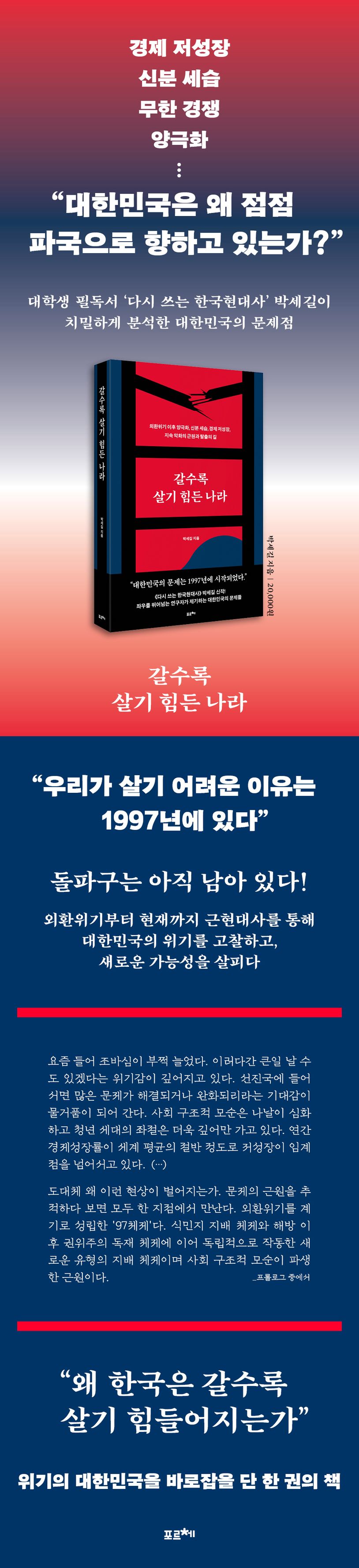 경제 저성장, 양극화, 신분 세습, 무한 경쟁… 2024년 한국의 봄, 탈출구가 없어 보이는 위기의 대한민국을 관통하는 문제다. 경제 성장이 멈춰 ‘피크 코리아’라고 불리며, 집값 상승, 양극화와 신분 세습이 점점 강해져 대부분 국민은 가만히 있는 죄로 좌절감이 드는 시절이다. 대한민국의 이런 사회 문제는 왜 시작됐을까? 이 위기에서 탈출할 수 있는 대안은 있을까? 《갈수록 살기 힘든 나라》는 1997년 이후의 근현대사를 바탕으로 대한민국 현황과 문제를 분석하고 여러 국내외 사례를 기반으로 대안을 제시하는 책이다. 저자 박세길은 대학생 필독서 《다시 쓰는 한국현대사》를 썼고 한국의 근현대사에 가장 가까이 있는 연구자다. 《갈수록 살기 힘든 나라》는 왜 한국이 살기 힘들어졌는지 깊이 있게 연구한 결과물이자 구체적 대안을 제시하며 더 나은 세상을 만들어 보자는 시도다. 이 책을 통해 독자는 왜 대한민국이 갈수록 힘들어졌는지 이해할 수 있고 한국에 아직 남은 희망을 발견할 수 있을 것이다. 이 책을 누가 읽어야 할 것인가?