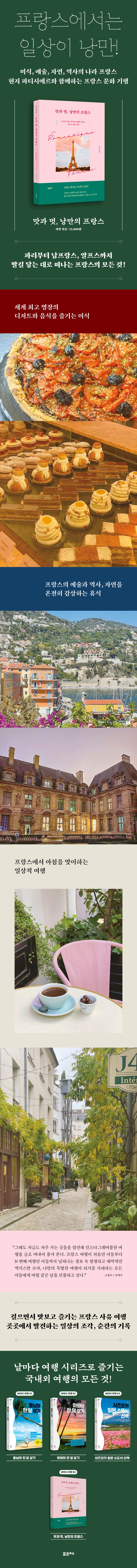 ‘프랑스’, 단어만 들어도 낭만이 가득하다. 머릿속에는 곧게 뻗어 있는 에펠탑이 떠오르고 고요히 흐르는 센 강이 그려진다. 그중에서도 특히 파리는 도시 그 자체로 낭만이다. 이런 프랑스에서 매일 아침을 맞이하면 어떨까? 저자는 빵의 고장, 프랑스 현지에서 파티시에르로 일한다. 어느 곳을 가든 ‘빵집’ 하나를 꼭 들러서 그곳의 맛을 탐미한다는 그. 《맛과 멋, 낭만의 프랑스》는 그간 그가 모아온 ‘프랑스 아카이브’라고 할 수 있다. 현지인이 아니라면 알 수 없는 공간과 빵집, 장소 등 꼭꼭 숨겨 둔 보물 같은 장소를 모두 담았다. 창문을 열면 에펠탑이 반기고, 비에 젖은 도시는 여전히 아름답게 느껴진다. 책에는 넘치는 정보 속에서도 생생한 정보를 가득 모았다. 또 프랑스의 매력을 그대로 느낄 수 있도록 알짜배기만 소개한다. 프랑스 여행이 처음인 이들부터 N 번째 여행으로, 새로운 프랑스를 경험하고 싶은 이들까지 나만의 특별한 여행을 만들 수 있을 것이다.
