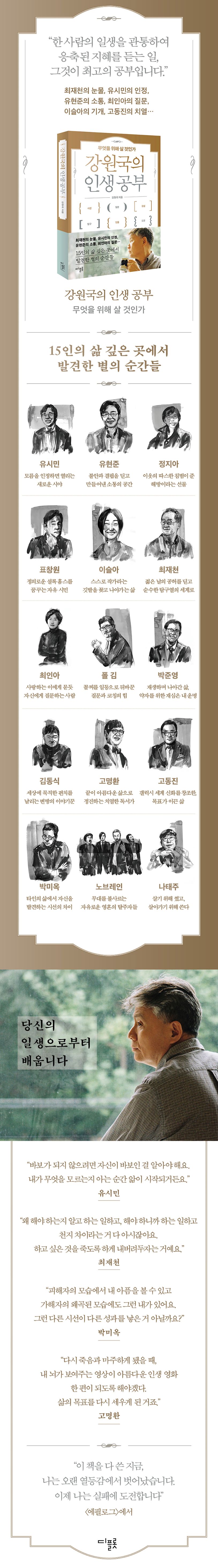 시대의 최전선에서 변화를 이끌고 때로는 우리 삶의 아픔을 보듬어온 15인을 강원국이 직접 만나 내밀한 인생의 역사와 살아갈 지혜를 공부했다. 강원국은 지금 우리 사회에서 희망의 이정표로 떠오른 300인의 삶을 2년 넘도록 경청했고, 그 가운데 교육, 과학, 법조, 건축, 문학 등 분야 최고의 명사 15인 인생의 정수를 이 책에 담았다. 한 사람의 일생을 관통하며 응축된 지혜를 듣는 일이야말로 최고의 공부라는 강원국은 이 책을 통해 공부로써의 대화가 가장 빛났던 순간들을 엮어냈다.