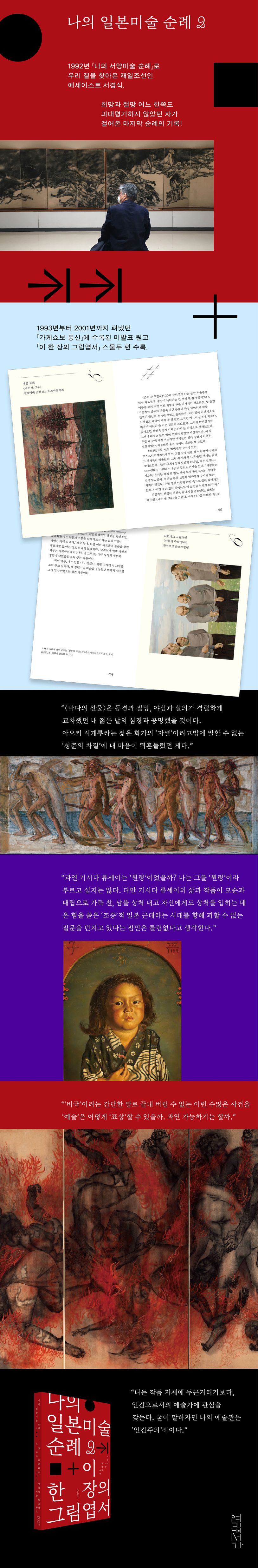 이에 대한 진지한 답변이 나고 자란 일본의 미술을 통해 펼쳐진다. 이 책은 그의 유고와 미공개 글을 포함한 총 3부로 구성되었다. ‘나의 일본미술 순례’에는 아오키 시게루, 기시다 류세이, 마루키 이리와 마루키 도시, 근대 일본미술가의 삶을 따라가며 아름다움의 의미를 되묻는 여정이 담겼다. 별세 이후 서재에서 발견된 소책자 속 글 모음 22편이 새롭게 수록되었다. 세계 곳곳의 미술관에서 모은 엽서 속 카라바조, 오토 딕스, 케테 콜비츠, 그리고 낯설지만 강렬한 그림들이 마지막 순례의 여정을 이어준다. 1부, 3부의 미술 순례기를 잇는 수필「부서진 말」(2005년 10월 발표, 국내 첫 공개)이 다리와 같은 역할을 한다. 2부에서는 전쟁과 재난의 표상 불가능성에 도전하며 ‘증인으로서의 괴로움을 떠안은 사람’이었던 피폭 문학가 하라 다미키의 삶을 반추하며 우리에게 묵직한 질문을 안긴다.