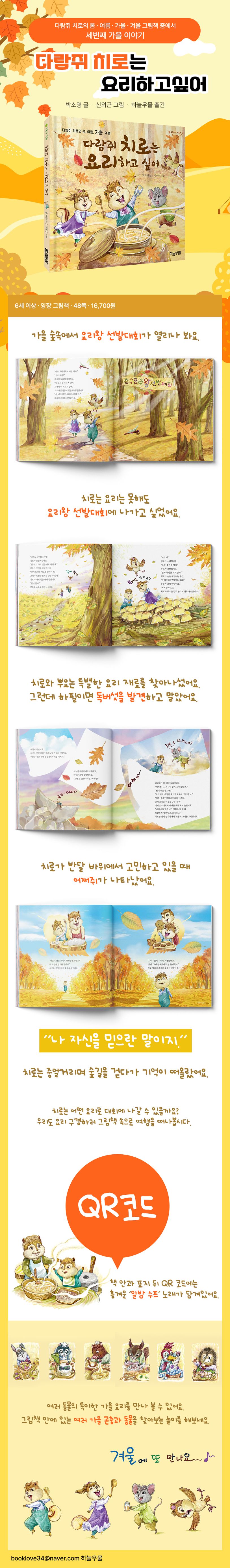 호기심이 많고 적극적인 치로의 가을 이야기가 펼쳐져요. 요리대회에 나가기 위해 친구인 뿌요, 어쩌쥐, 참새의 도움을 받아 준비하는 과정이 담겨 있는 이야기지요.