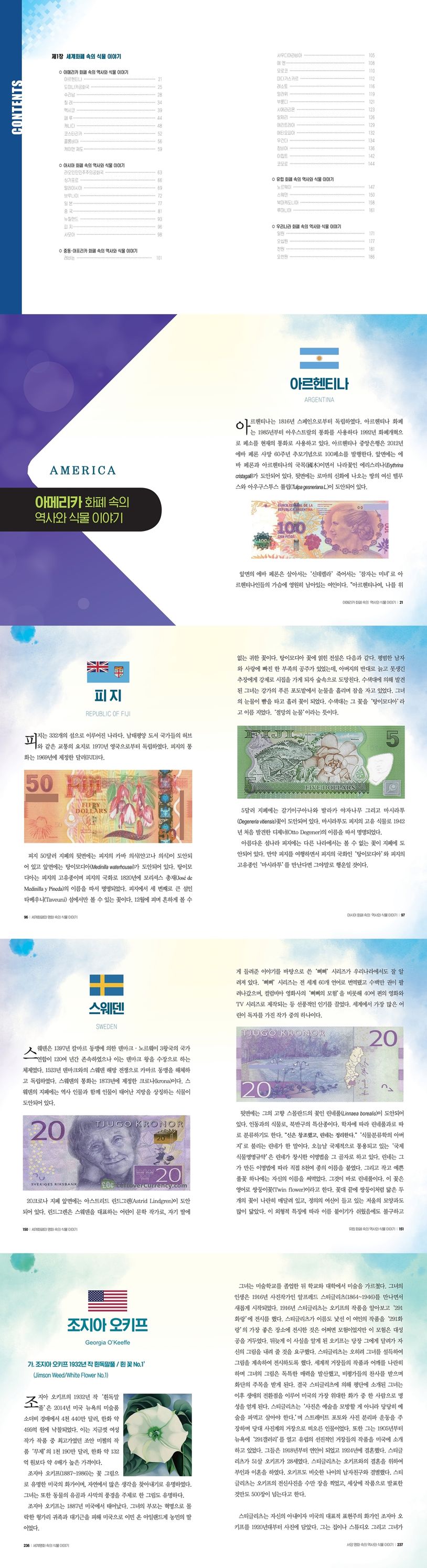 제1장 ‘세계 화폐 속의 식물 이야기’는 세계 각국의 화폐에 담겨 있는 다양한 식물들을 분석하고 그 식물이 해당 국가에서 가지고 있는 역사적, 문화적 의미를 흥미로운 이야기와 함께 엮어내고 있는 장입니다. 아르헨티나의 가장 사랑받은 영부인으로서 국모(國母)로 추앙받는 에바 페론의 생애와 아르헨티나의 나라꽃인 ‘닭벼슬나무’ 에리스리나의 이야기, 코스타리카 화폐에 담긴 해바라기가 북미 대륙에서 스페인을 거쳐 러시아 땅에 도착한 사연, 목숨을 걸고 독재에 저항하여 ‘세계 여성폭력 추방의 날’을 만들어낸 도미니카 화폐 속 세 자매와 도미니카의 국화 마호가니 꽃의 이야기 등 우리가 잘 몰랐던 세계 곳곳의 식물과 역사 이야기가 흥미진진하게 펼쳐집니다.
