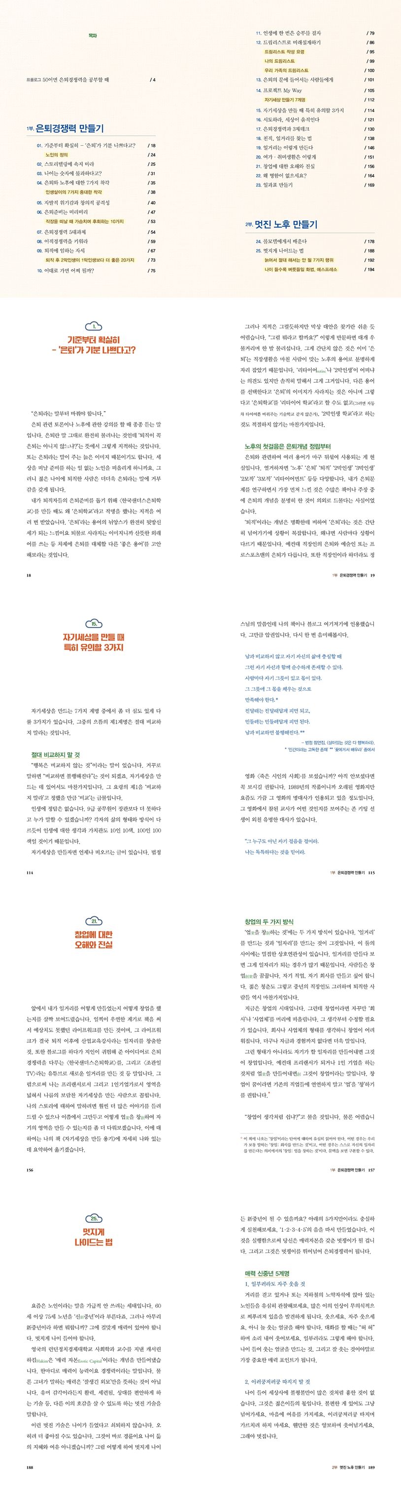 프롤로그50이면은퇴경쟁력을공부할때/41부.은퇴경쟁력만들기01.기준부터확실히-‘은퇴’가기분나쁘다고?/18노인의정의/2402.스토리텔링에속지마라/2503.나이는숫자에불과하다고?/3104.은퇴와노후에대한7가지착각/35인생살이의7가지중대한착각/3805.자발적위기감과창의적공격성/4006.은퇴준비는미리미리/47직장을떠날때가슴치며후회하는10가지/5307.은퇴경쟁력5대과제/5408.이직경쟁력을키워라/5909.퇴직에임하는자세/67퇴직후2막인생이1막인생보다더좋은20가지/7310.이대로가면어찌될까?/7511.인생에한번은승부를걸자/7912.드림리스트로미래설계하기/86드림리스트작성요령/95나의드림리스트/99우리가족의드림리스트/10013.은퇴의문에들어서는사람들에게/10114.프로젝트MyWay/105자기세상만들기7계명/11215.자기세상을만들때특히유의할3가지/11416.시도하라,세상이움직인다/12117.은퇴경쟁력과3재테크/13018.천직,일거리를찾는법/13819.일거리는이렇게만든다/14620.여가·취미생활은이렇게/15121.창업에대한오해와진실/15622.왜명함이없으세요?/16423.일과표만들기/1692부.멋진노후만들기24.롤모델에게서배운다/17825.멋지게나이드는법/188늙어서절대해서는안될7가지행위/192나이들수록버릇들일화법,에스프레소/19426.가늘어도명품인생/19627.자기를젊게관리하라/20128.당신은얼마나젊은가?/20629.인생을즐기는법/20930.활기와열정을잃지않으려면/218열정을불러일으키는명언/222삶을무기력하게하는원인찾아보기/22331.문제는행복이야,바보야!/224나이들면마음에담을‘내로남불’/23332.퇴직·은퇴남편의처신/23433.퇴직·은퇴남편을둔아내의처신/23934.자녀와의관계재정립하기/24535.인맥형성과친구사귀기/25036.은퇴자의‘인생드라마’남기기/258책쓰기-글을쉽게쓰는법/264에필로그새로운각오로‘업스타팅(UpStarting)’하라/266교육프로그램〈한국샌더스은퇴학교〉ⓡ/270출간후기/271