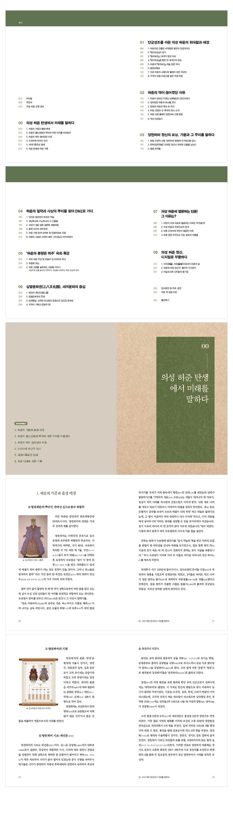 004머리말008추천사020의성허준선생연보00의성허준탄생에서미래를말하다0301.허준의가문과출생배경0352.허준의출신성분과뿌리에대한무지를바로잡다0493.허준의맥이끊어졌던이유0524.드라마에허구도있다0715.세계기록유산등재0726.허준탄생에대한기록01단군성조를이은의성허준의위대함과배경0841.허준이란인물은세계문명발전의징검다리다0872.『동의보감』의평가0913.『동의보감』!세계가탐낸의서0954.『동의보감』을향한전세계인의관심0995.허준의『동의보감』저술관련역사1146.음양오행표1227.의성허준의고향이자출생지장단우근리1238.구국의성웅이순신을살린의성허준02허준의맥이끊어졌던이유1341.허준이잊혀진이유는남북분단이원인이었다1392.잊혀졌던허준의묘소를찾다1403.양평군허준과후손묘위치1434.허준선생과선·후대의묘소소개1505.허준선생출생지양천허씨고향탐방1576.역사바로잡기03양천허씨정신의표상,가문과그뿌리를말하다1631.화담서경덕선생,양천허씨종중에도가정신을심다1672.천부경(天符經),위대한정신이위대한인물을낳는다1763.종중묘역들04허준의철학과사상의뿌리를찾아DMZ로가다1801.임진강문화권의토양과역할1852.영남학파와기호학파의그인물들1943.최장기정승방촌황희와세종대왕1984.율곡이이의유비무환2005.허준선생묘역성역화및관광자원화사업2146.허준의스승은서경덕제자,선인(仙人)박지화였다05‘허준의본향은파주’국회특강2321.국회허준특강및오늘이있기까지의역사2362.추향제모심2423.허준선생을흠모하는사람들이야기티눈으로눈물흘리던아주머니,티눈을고쳐주신‘허준선생’께감사06삼팔문화권(三八文化圈),세계문화의중심2501.예언서해인도(偕仁道)2562.삼팔문화권의특성2663.삼국통일,고려와조선왕조탄생시킨임진강문화권2684.구국의거북선탄생의땅!07의성허준에열광하는민중!그이유는?2841.국민이의성허준에열광하는이유는무엇일까?2852.의성허준과주변인과의관계2923.허준드라마에국민이열광한이유3104.허준관련구전되고있는설화의내용들08의성허준정신,디지털로부활하다3151.어의(御醫),의성(醫聖)으로서의허준의삶3232.허준에대한정신적·물리적가치평가3273.아날로그와디지털의분기점328참고문헌및자료,증언330허준책집필이유332출간후기