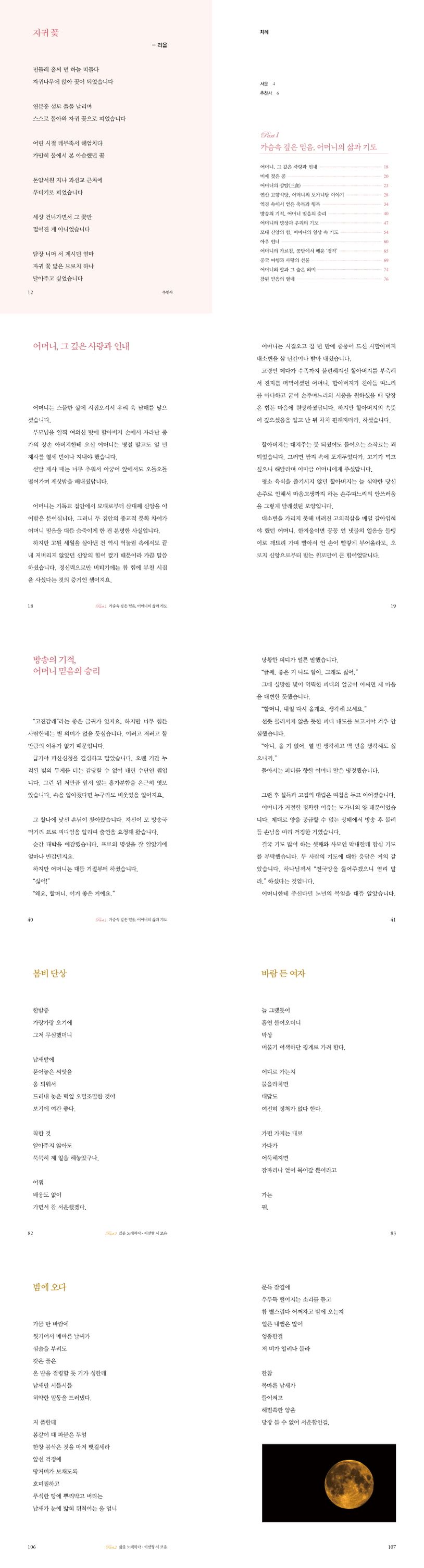 서문4추천사6part1가슴속깊은믿음,어머니의삶과기도어머니,그깊은사랑과인내18비에젖은콩20어머니의삼탐(三貪)23연산고향식당,어머니의도가니탕이야기28역경속에서얻은축복과행복34방송의기적,어머니믿음의승리40어머니의병상과우리의기도47모태신앙의힘,어머니의일상속기도54아우언니60어머니의가르침,콩밭에서배운‘정직’65중국여행과사랑의선물69어머니의말과그숨은의미74참된믿음의열매76part2삶을노래하다-이선형시모음봄비단상82바람든여자83시월85가을나기86야상(夜想)88모과90가을여정92심상(心狀)94하시절95칠월96눈꽃97까마귀98비맞은마당100그는실로102어떤휴식103비야104바람난봄105밤에오다106쑥캐는여자108나어릴적에110앵두112달113어떤자유인114옛날의금잔디116알고싶어118가을볕119가을별곡120일상중에122갈바람123불면124지금은126단비가오는밤127가을스케치128영정129가을끝자락에서130석류131허수아비단상132part3평소우리엄마가좋아했을글어머니의발136남을긍휼히여기는마음,공감139선행의아름다움141감사하는마음143일상의소중함145인덕(人德)을쌓는하루147친절의힘149