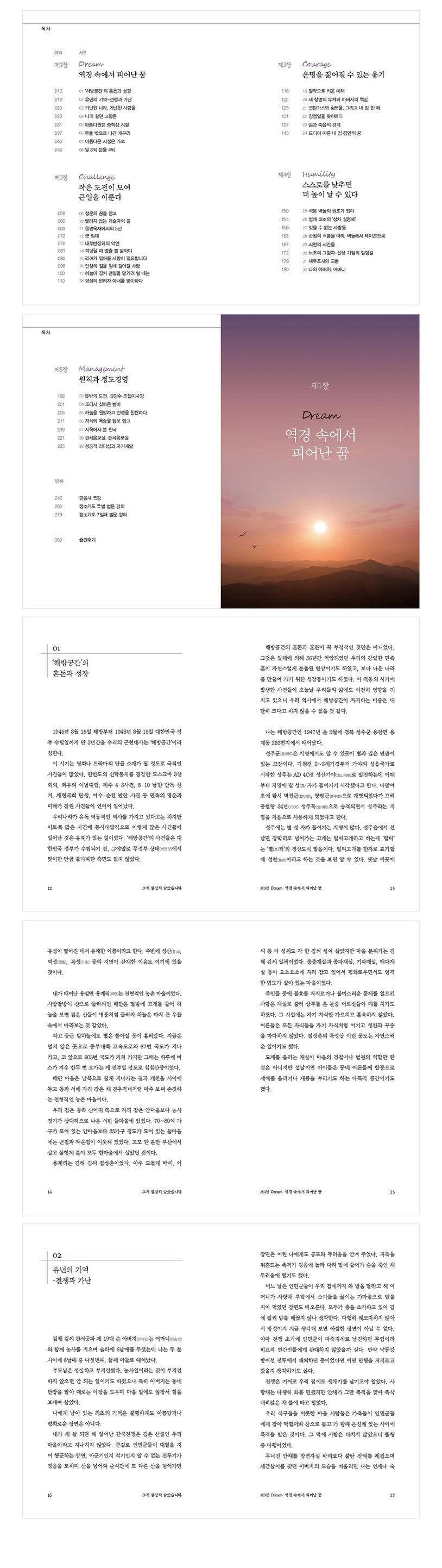 또한 ‘부록’을 통해 이야기하는 김윤기 회장의 성공 철학 역시 주목할 만합니다. “해야 할 것은 무슨 일이 있어도 반드시 해야 하고 하지 말아야 할 것은 절대로 해서는 안 된다”는 김윤기 회장의 철학은 ‘자기통제’와 ‘감사’로 요약할 수 있습니다. “감사하는 마음으로 일을 하다 보면 분노나 싫증을 느낄 새가 없기 때문에 항상 마음이 편안하고 일에 능률이 오를 수밖에 없다. 그러다 보면 수입은 자연스럽게 따라오게 되어 있다”로 시작하는 김윤기 회장의 어록은 우리가 일과 직업을 어떻게 대해야 하는지에 대한 실마리를 제공할 것입니다.