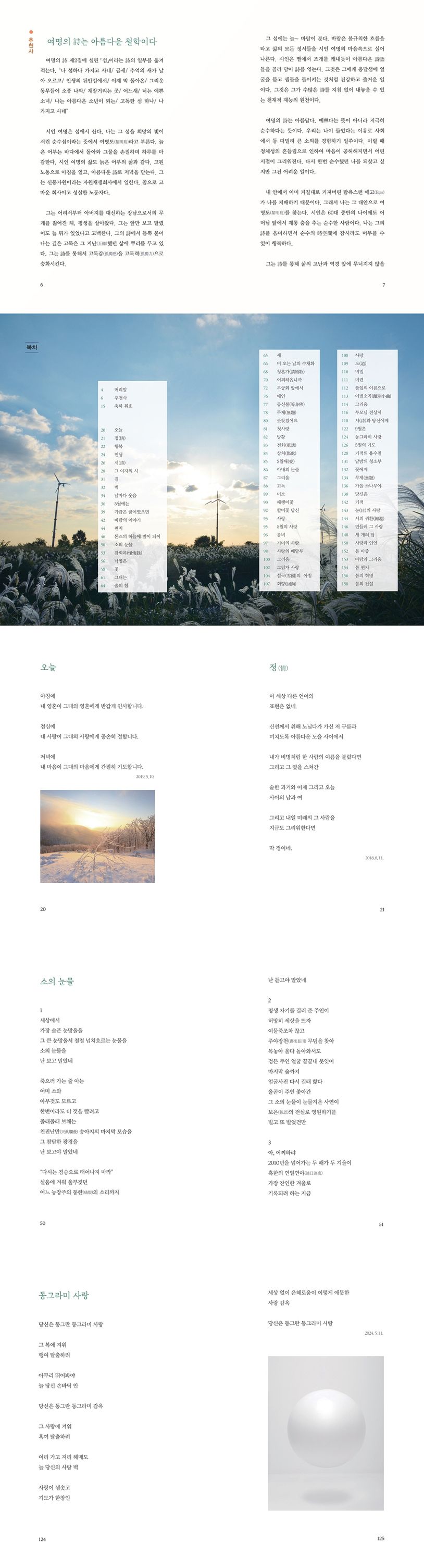 또한 그의 시는 ‘순수함’을 느낄 수 있는 글이기도 하다. 그의 시는 특별한 사상을 기치(旗幟)로 내걸지도 않고, 교조(敎條)적으로 타인을 가르치려고 하는 모습도 없다. 마음에서 우러나오는 다양한 정서를 꾸밈과 지어냄 없이 자연스럽게 풀어내는 모습에서 따스함을 느낄 수 있으며 항상 깊은 감정이 흘러넘치고 있다. 바로 그 감정의 근원에 ‘사랑’과 ‘고독’이 있다는 것이 시의 행간을 읽으면 읽을수록 느껴진다.