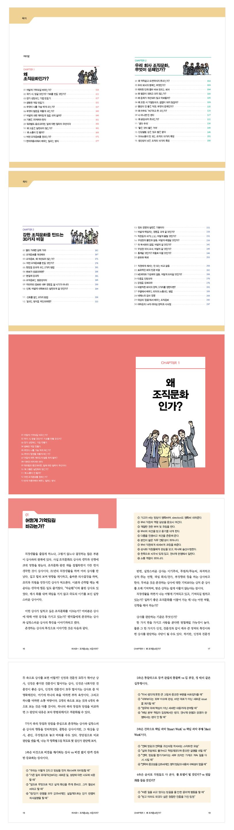 이러한 책의 기본 골자에 발맞추어 제1장 ‘왜 조직문화인가?’에서는 직원을 가슴 뛰게 만들고, 더 일하고 싶어 하는 기업의 조직문화와 철학 전반을 분석하며 제2장 ‘우리 회사 조직문화, 무엇이 문제인가?’에서는 많은 기업, 특히 조직문화에 신경 쓸 여유가 부족한 소규모 기업에서 겪기 쉬운 대표적 조직문화의 병폐 15가지를 조목조목 예로 들면서 날카로운 분석으로 대안을 제시한다.
