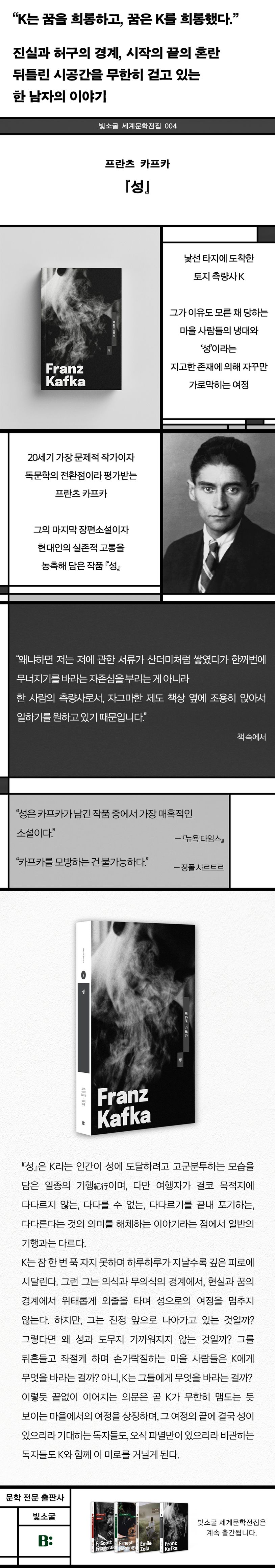 카프카의 작품들 중 ‘가장 매혹적인 소설’(『뉴욕 타임스』), ‘가장 아름답고 서정적인 소설’(『가디언』) 등의 찬사를 받는 『성』은, 낯선 타지에 도착한 토지 측량사 K가 이유도 모른 채 당하는 마을 사람들의 냉대와 ‘성’이라는 지고한 존재에 의해 자꾸만 가로막히는 여정을 카프카 특유의 환상적 리얼리즘으로 그려낸 소설이다. 다시 말해 『성』은 K라는 인간이 성에 도달하려고 고군분투하는 모습을 담은 일종의 기행紀行이며, 다만 여행자가 결코 목적지에 다다르지 않는, 다다를 수 없는, 다다르기를 끝내 포기하는, 다다른다는 것의 의미를 해체하는 이야기라는 점에서 일반의 기행과는 다르다.