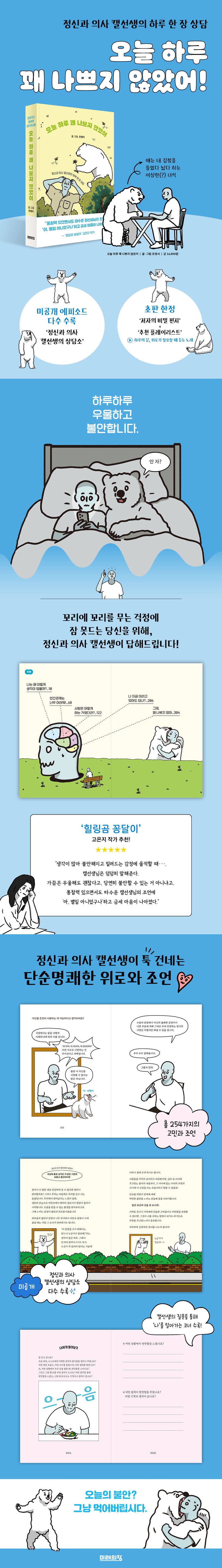 꼬리에 꼬리를 무는 걱정에 잠 못 드는 날은 이제 그만! 우리에게 단순명쾌한 조언과 응원을 해줄 정신과 의사 캘선생의 《오늘 하루 꽤 나쁘지 않았어》가 출간됐다. 이번 책은 SNS에서 종종 진행했던 ‘물어보고 답하기’를 재구성해 엮은 것으로, 인간관계, 직장생활, 연애 등 일상을 뒤흔드는 크고 작은 문제들에 대해 정신과 의사 캘선생이 254개의 답변을 건넨다. 하루치 걱정을 덜어줄 유쾌한 답변과 함께 내 감정을 되짚어 볼 수 있는 ‘정신과 의사 캘선생의 상담소’와 ‘나에게 물어보기’를 수록해 하루 한 장 상담의 깊이를 더했다. 크고 작은 일 때문에 힘들고, 감정이 불안한 오늘 하루. 그런 하루에 캘 선생의 조언은 작은 위로와 응원이 될 것이다.
