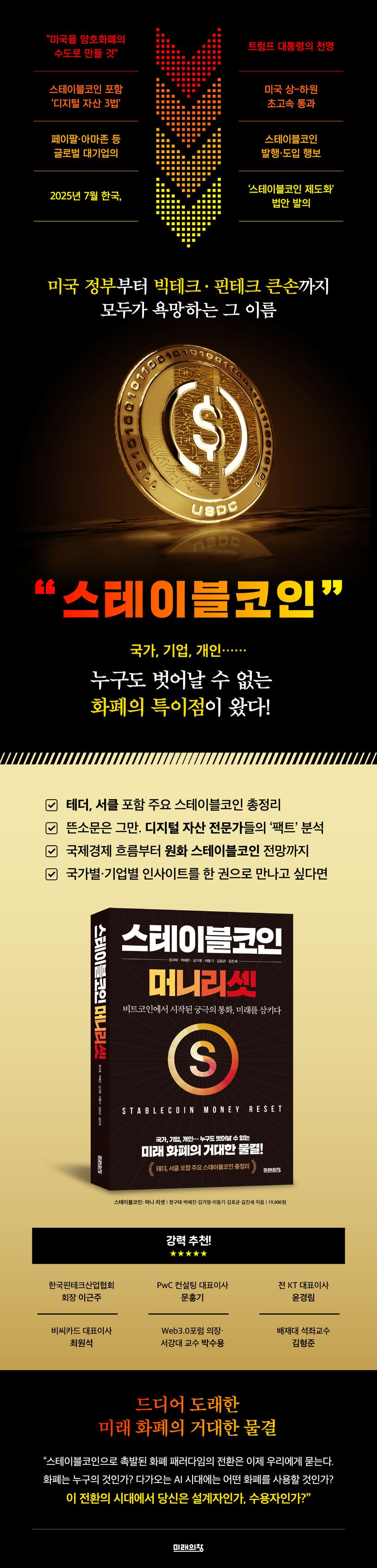 프롤로그1장.왜지금스테이블코인인가-잊혀진꿈방코르와스테이블코인의서곡-조용하지만거대한시작점-스테이블코인의정의와종류-금융인프라를뒤흔드는혁신2장.기업이만든돈:메타부터테더까지-디파이,스테이블코인의기능에수요를더하다-메타,리브라:실패했지만의미있는디지털달러-테더,USDT:그림자금융에서글로벌준비자산으로-서클,USDC:미국정부와가장가까운스테이블코인-리플랩스,RLUSD:고성능블록체인기반의송금특화형실험-페이팔,PYUSD:결제회사에서스테이블코인발행사로-팍소스,USDP:신뢰를제도화한스테이블코인의모범생-바이낸스,BUSD:세계1위거래소의도전과실패-미국국채시장의새로운게임체인저3장.세계는지금,스테이블코인전쟁중-위협인가,기회인가?국가별대응전략-미국:규제와민간인프라가함께움직이는실험실-유럽연합:디지털자산을명확한질서안에서도입하다-홍콩,일본,싱가포르:라이선스를쥐고혁신을조율하다-제3세계의사정:생존을위한대체통화-스테이블코인을통한국경간송금혁신-기업형스테이블코인:어쩌면선택이아니라필수-한국은행:스테이블코인은화폐의대체재다-CBDC:스테이블코인의대항마가될수있을까?4장.현금의종말과새로운디지털금융혁명:스테이블코인의현실과미래-핀테크흥망의역사가보여주는스테이블코인의미래-공존이라는현실적대안-스테이블코인이풀어야할과제-스테이블코인과전통금융의공존-원화스테이블코인과한국의미래에필로그