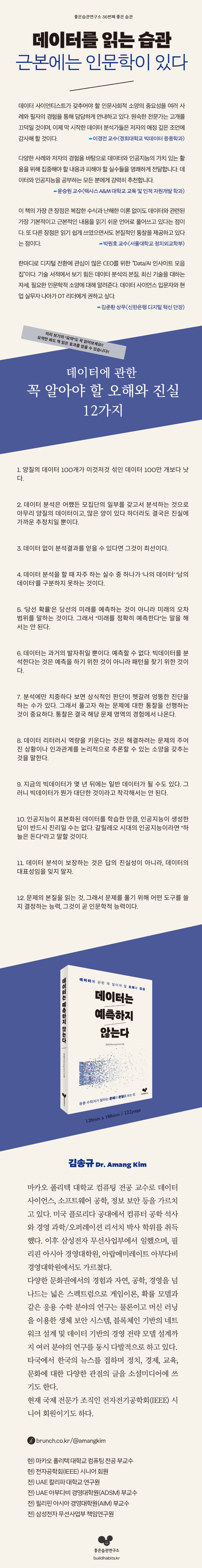 데이터로 의사결정을 해야 하는 사람들 그리고 데이터로 의사결정 하는 것이 필요하다고 주장하는 사람들을 위한 책이 나왔다. 이 책은 우리가 알고 있던 데이터에 대한 지식이 얼마나 잘못된 것이 많으며, 이를 제대로 알지 못하면 어떤 실수를 범하게 되는지 여러 사례를 통해 밝히고 있다. 그리고 이런 실수에서 벗어나기 위해서는 인문학적 통찰이 중요하다는 것도 잊지 않고 강조한다.