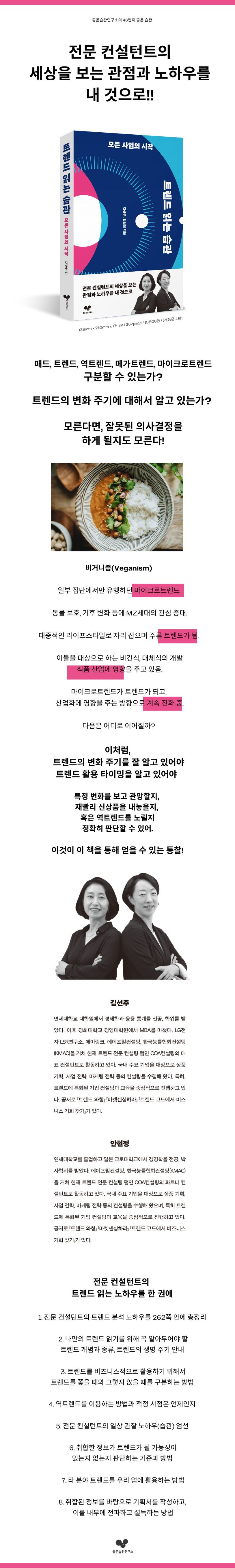 이 책은 우리가 잘못 알고 있거나 꼭 알아 두어야 할 트렌드에 대한 기초 지식을 다루고, 트렌드 읽기를 위해 평소 어떤 습관이 필요한지 알려준다. 그리고 비즈니스 활용을 위해 어떤 점에 주의해야 하는지, 무엇을 놓치지 말아야 하는지 알려준다. 오랫동안 기업을 상대로 신상품 기획과 트렌드 컨설팅 업무를 전문적으로 해온 저자의 관점과 노하우을 한 권에 모았다. 이 책은 2020년 출간된 〈트렌드 읽는 습관〉의 개정증보판으로 분석 노하우와 방법 등을 보강한 업그레이드 버전이다.