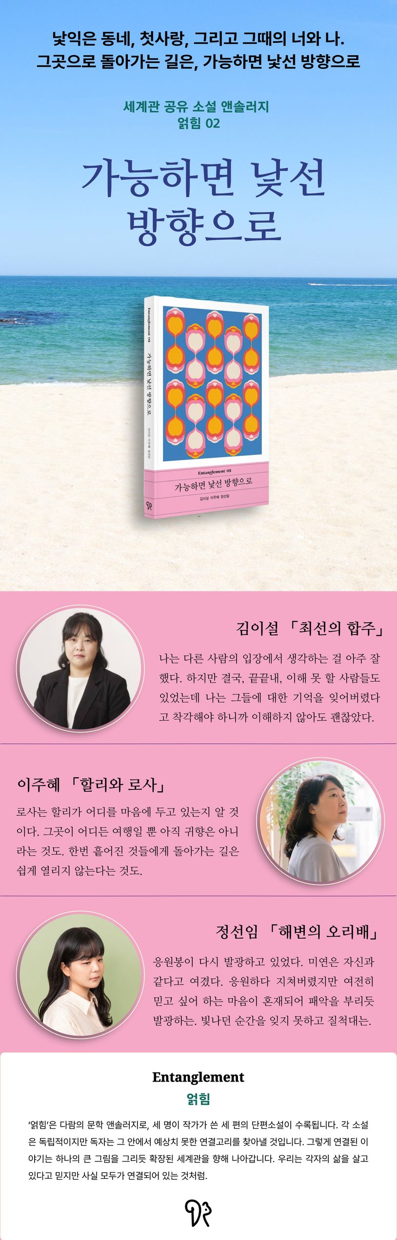 한국문학 앤솔러지 ‘얽힘’의 두 번째 프로젝트 『가능하면 낯선 방향으로』가 출간되었다. 얽힘 2기에는 한국 문학의 중심에서 굵직한 작품들로 독자들의 신뢰를 받아온 김이설, 이주혜, 정선임 작가가 참여했다. 이들은 한때 익숙했지만 이제는 흩어져 버린 사람과 장소, 기억을 마주하는 마음을 테마로, 각자의 방식으로 얽힘 프로젝트를 완성했다. 그렇게 완성된 『가능하면 낯선 방향으로』에는 이주혜의 「할리와 로사」, 정선임의 「해변의 오리배」, 김이설의 「최선의 합주」가 수록되어 있다. 세 작품은 첫사랑, 낯익은 동네, 그리고 한 시절의 추억과 상처가 깃든 장소로 돌아가는 여정을 각기 다른 시선으로 섬세하게 그려냈다. 책의 마지막에는 작가들이 서로에게 던진 질문과 답변을 담은 「얽힘 코멘터리」가 수록되어있다. 이를 통해 독자들은 『가능하면 낯선 방향으로』의 기획부터 집필까지 세 편의 소설이 어떻게 완성되었는지, 그리고 그 과정에서 각 소설뿐만 아니라 세 작가가 어떻게 얽히게 되었는지를 엿볼 수 있을 것이다. 또한 각 작품의 독립적인 성취뿐만 아니라, 이들이 모여 함께 도달한 문학적 지점을 가늠해 볼 수 있을 것이다.