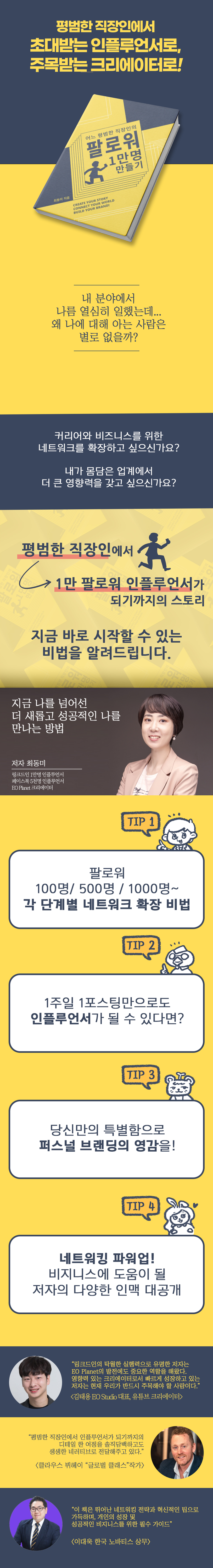 평범한 회사원이었지만 지금은 인플루언서가 되어 활발히 활동 중인 저자는 스타트업 육성 및 투자를 운영하는 지방의 한 비영리재단에서 현재 7년간 창업지원 전문가로 활동하고 있다. 이 책은 저자가 2년 만에 1만 명의 팔로워를 가진 액티브한 링크드인 인플루언서가 된 과정을 담담하면서도 생생하게 보여준다.