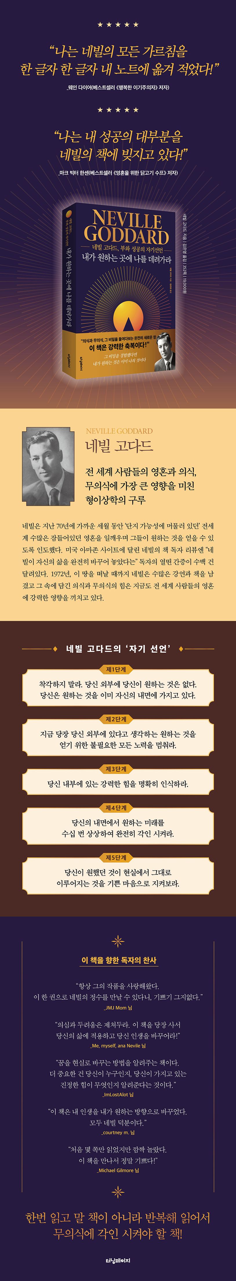 의식과 무의식의 비밀을 찾은 위대한 탐험가이자 영원한 구루, 네빌 고다드! 네빌은 지난 70년에 가까운 세월 동안 ‘단지 가능성에 머물러 있던’ 전 세계 수많은 잠들어있던 영혼을 일깨우며 그들이 원하는 것을 얻을 수 있도록 인도했다. 미국 아마존 사이트에 달린 네빌의 책 독자 리뷰엔 “네빌이 자신의 삶을 완전히 바꾸어 놓았다는” 독자의 열띤 간증이 수백 건 달려있다. 생존하는 최고의 자기계발서 저자인 ‘웨인 다이어’와 ‘마크 빅터 한센’도 네빌 고다드가 자신의 인생을 완전히 바꾸어 놓았다고 고백한 바 있다.