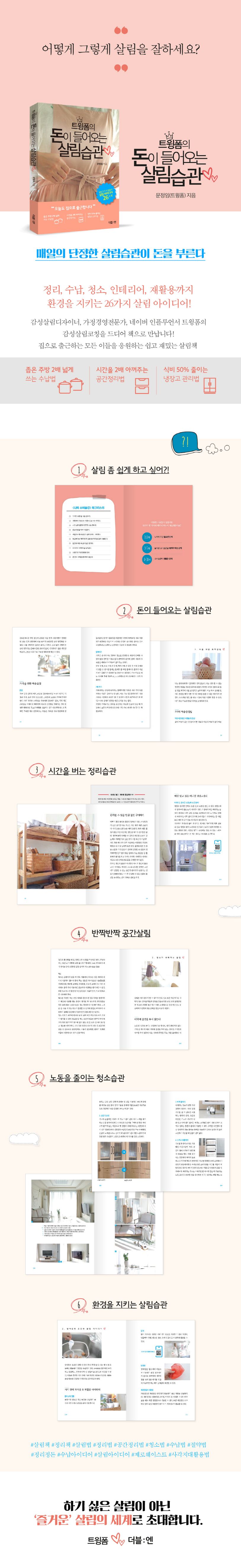 하기 싫은 살림이 아닌 ‘즐거운’ 살림을 예쁘게 보여주는 트윙폼의 첫 책이 출간되었다. 블로그와 인스타그램, 유튜브 〈트윙폼 감성살림한스푼〉을 통해 많은 주부들과 소통을 해온 트윙폼 문정임 작가는 책을 통해 ‘불필요한 노동을 줄이고’ ‘시간과 돈을 버는’ 살림의 세계로 친절하게 안내하고 있다. 책은 〈살림 좀 쉽게 하고 싶어?!〉 〈돈이 들어오는 살림습관〉 〈시간을 버는 정리습관〉 〈노동을 줄이는 청소습관〉 〈반짝반짝 공간살림〉 〈환경을 지키는 살림습관〉 등 총 6장으로 구성했다.