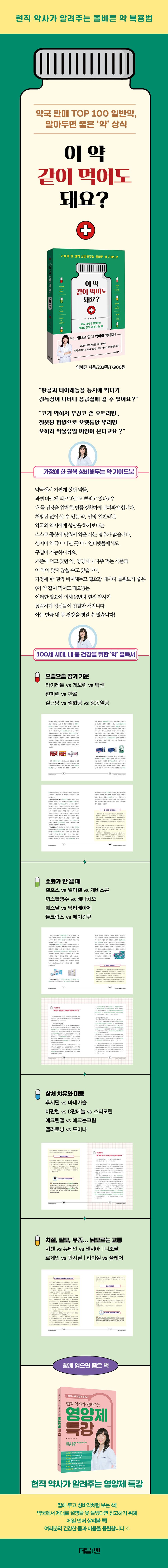 《이 약 같이 먹어도 돼요?》는 일반약 매출 상위 100개 제품 중 다빈도 제품을 감기약, 눈코입목, 소화관련, 종합영양제, 상처치유, (치질 탈모 등의) 남모르는 고통, 6개 항목으로 나누어 함유하고 있는 성분, 기저질환으로 먹고 있는 약과의 상호작용으로 인한 부작용의 가능성 등을 자세하게 설명하고 있다.