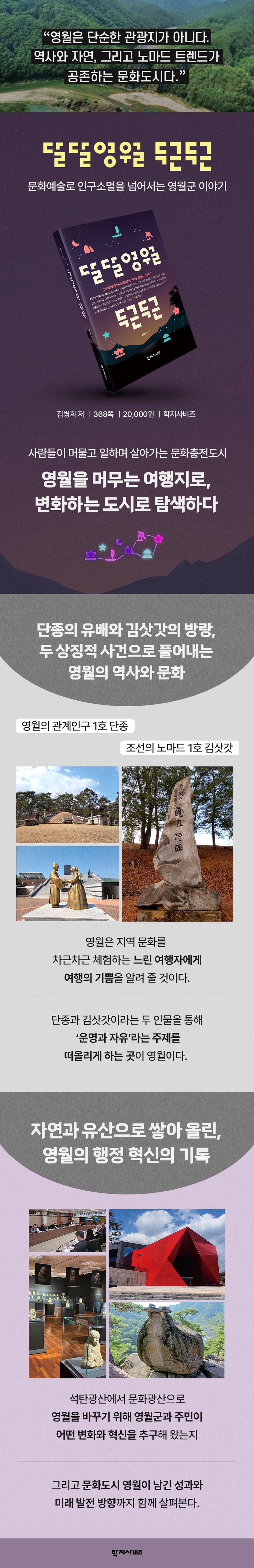 태백산맥을가로질러동강과서강이모이는천혜의자연으로유명한강원특별자치도영월군(군수최명서)은노마드(nomad)의고장이다.영월은조선왕조의제6대왕단종의유배지로한국사에서중요한의미를지닌영월은짧고비극적인단종의일생이스며있는역사문화공간이자,조선후기에한반도를안방처럼떠돌던방랑시인김삿갓이한때살던곳이자지금도묻혀있는곳이다.서원대광고홍보학과의김병희교수는최근『달달영월두근두근:문화예술로인구소멸을넘어서는영월군이야기』이라는책을출간했다.