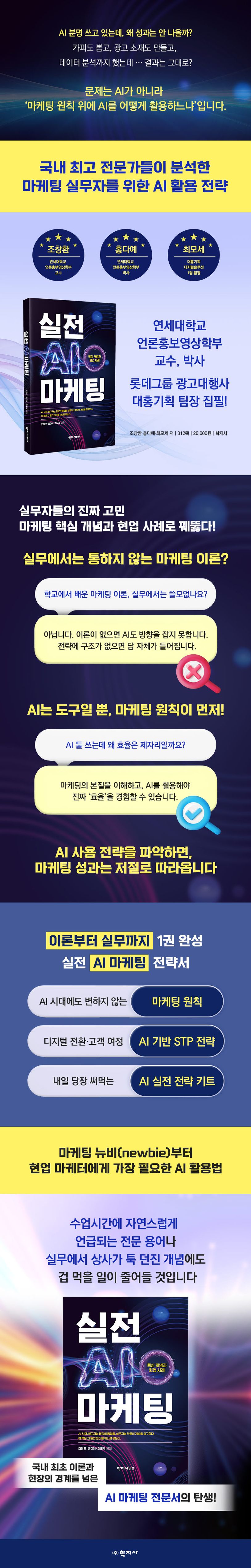 『실전 AI 마케팅』은 기술을 설명하는 데 머무르지 않는다. AI의 작동 원리를 이해하고 데이터를 전략으로 전환하는 마케팅 사고의 새로운 기준을 제시한다.