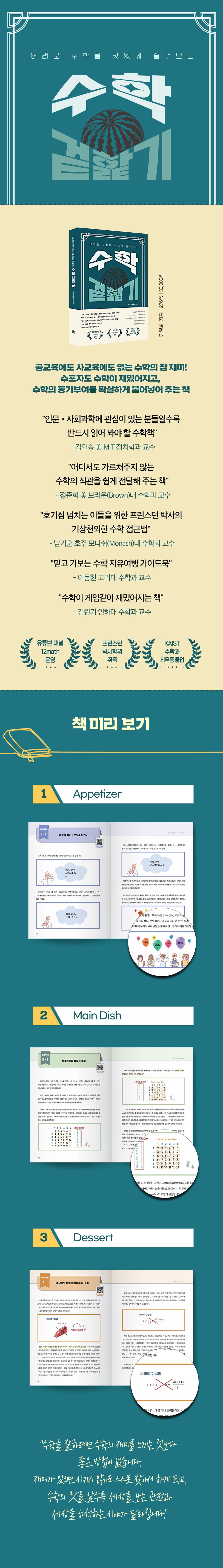 베리의 역설, 캘리 비율, 피보나치 수열, 실베스터 정리, 귀납법, 귀류법 등 다양한 정의부터 오일러 포뮬러 체스, 테트리스, 카드 게임 등 일상의 내용을 수학적으로 풀어낸 흥미로운 얘기까지!