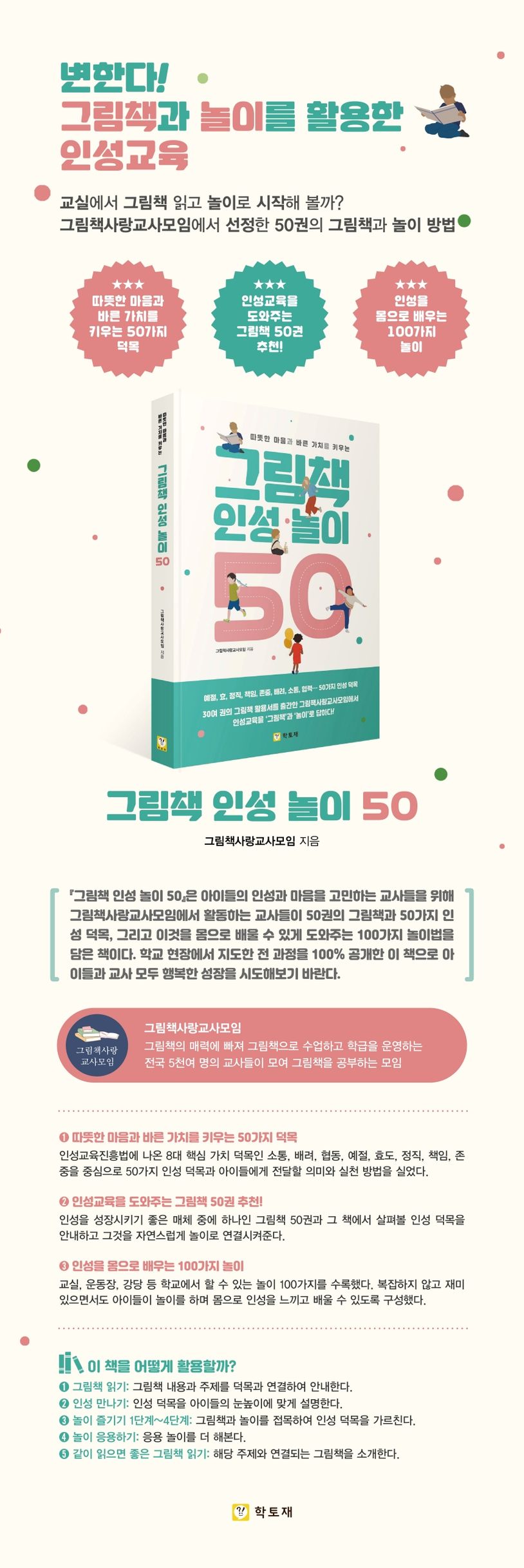 『그림책인성놀이50』은아이들의인성과마음을고민하는교사들을위해그림책사랑교사모임에서활동하는교사들이50권의그림책과50가지인성덕목,그리고이것을몸으로배울수있게도와주는100가지놀이법을담은책이다.그림책과놀이는아동청소년이인성을발달시키는가장좋은매체이다.그림책을읽고놀이로즐기는과정에서아이들의인성이자연스럽게,그리고단단하게성장하기때문이다.30여권의그림책활용서를집필한그림책사랑교사모임이선정한50가지덕목과그림책,그리고그리고학교현장에서지도한전과정을100%공개한이책으로아이들과교사모두행복한성장을시도해보기바란다.
