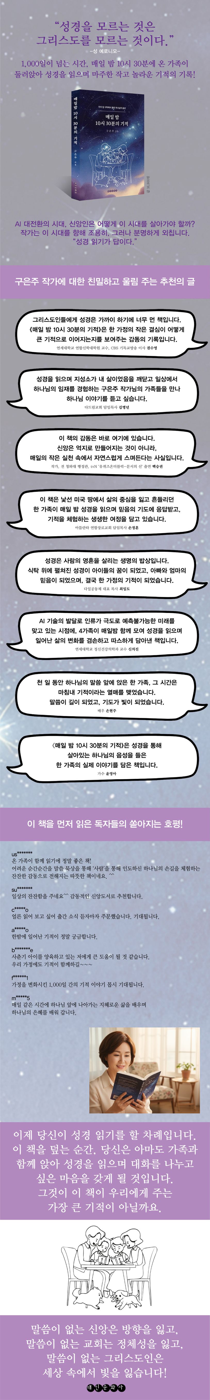 친척 하나 없는 낯선 미국 땅에서 그녀의 가족이 선택한 것은 매일 밤 10시 30분, 식탁에 모여 성경을 읽는 것이었다. 이 책은 한 줄 한 줄 말씀을 쌓아 올리며 가족의 회복을 경험한 그녀의 진솔한 고백이며, 하나님의 은혜에 대한 감사의 기록이다.