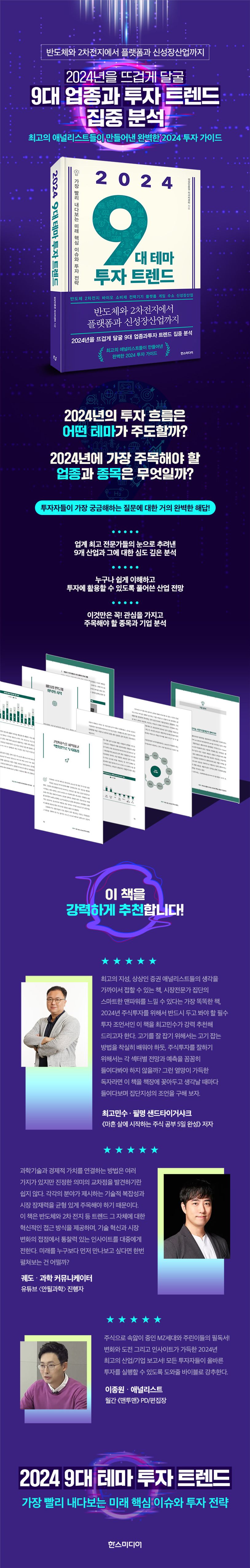 이러한 고민을 하고 있는 이들에게 신간 《2024 9대 테마 투자 트렌드》는 투자자들이 한 해 동안 곁에 두고 틈틈이 꺼내 봐야 할 필독서가 될 것이다.