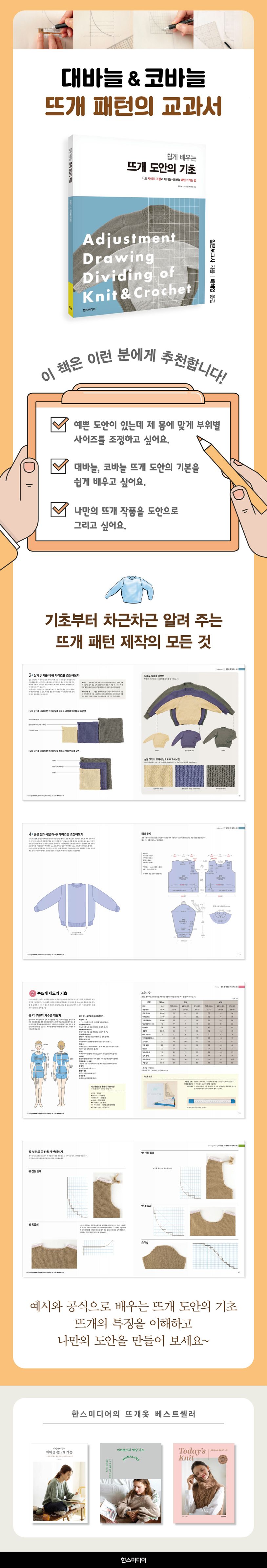 뜨개 패턴의 기본서가 국내 최초로 출간되었다. 대바늘과 코바늘 도안에 대한 설명을 모두 다루고 있어 니터에게 아주 유용한 책이다. 뜨개를 즐기다 보면 마음에 쏙 드는 뜨개 작품의 도안을 구매했는데 원하는 사이즈가 없거나 무늬는 마음에 드는데 어깨 너비나 핏을 조금 수정하고 싶은 경우가 한 번쯤은 있을 것이다. 이 책은 그런 분들의 답답함을 한 번에 해소할 수 있도록 도와준다. 천으로 만드는 일반 제도책과 달리 편물의 특성을 반영해 뜨개 도안에 대한 모든 것을 기초부터 차근차근 쉽게 알려준다. 실과 바늘을 바꿔서 사이즈를 조정하면 편물의 크기가 얼마나 달라지는지, 특정 부위의 사이즈를 조정하는 아이디어 등을 예시 작품을 통해 설명해 직관적으로 이해할 수 있다. 더 나아가 스웨터와 카디건의 뜨개 도안 그리는 법을 계산식과 함께 자세히 설명해 전반적인 핏을 수정하고 싶거나 나만의 작품을 도안으로 만들고 싶은 니터들에게도 유용하다.