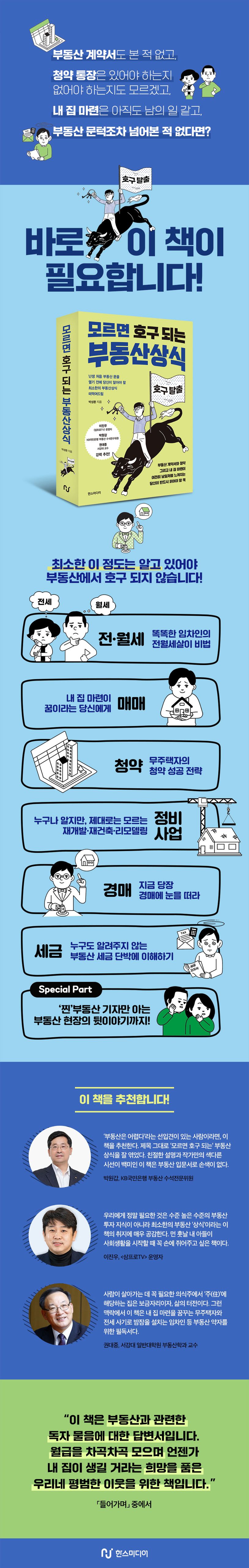 이 책 『모르면 호구 되는 부동산상식』은 한스미디어의 입문서 시리즈 『모르면 호구 되는』 시리즈의 신간이다. 아직 청약통장도 만든 적 없는 사회 초년생, 주기적으로 집을 옮겨 다녀야 하는 월세·전세 세입자, 매매 또는 청약을 통해 생애 첫 내 집 마련이란 꿈을 이뤄 보려는 실수요자 들부터 보다 수준을 높여 경매에 관심을 가져 보려는 사람, 부동산 세금 때문에 골머리를 앓고 있는 사람까지 ‘부동산’이란 키워드에 안테나를 세우고 있는 모든 이들에게 확실한 기초 지식을 깔아줄 수 있는 책이다. 이 책의 저자이자 뉴시스 건설부동산부에서 활동하고 있는 박성환 기자는 부동산 기자로 활동하면서 독자들의 질문을 수없이 받았다고 한다. 한 푼 두 푼 월급을 모아 내 집을 마련하려는 그들의 간곡한 질문에 답을 하려는 성실한 마음으로 첫 책을 써냈다. 또한 저자가 기자로서 관련 분야를 취재하며 보고 겪었던 ‘요즘 부동산 이야기’들을 Special Part로 구성해 책의 말미에 붙였다.