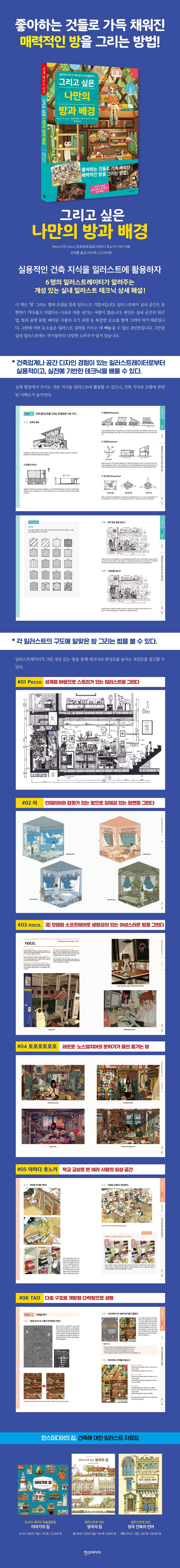 일러스트레이터 6인이 참여한 책이지만 전반부는 건축업계나 공간 디자인 경험이 있는 일러스트레이터로부터 실용적이고, 실전에 기반한 테크닉을 배울 수 있습니다. 실제 현장에서 쓰이는 전문 지식을 일러스트에 적용할 수 있으니 건축 지식과 조형에 관련된 이해도가 높아집니다.