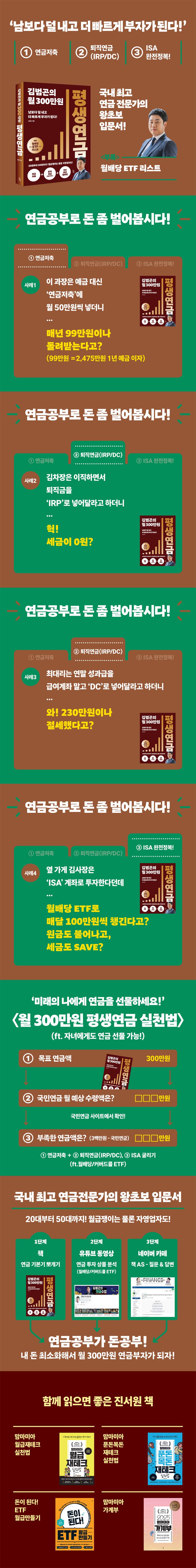이 책은 월 300만원 연금 목표를 달성하기 위해 ① 연금저축 + ② 퇴직연금(IRP/DC) ③ ISA 계좌를 권하며 어떻게 하면 안전하게 원금과 배당을 늘릴 수 있을지 설명한다.