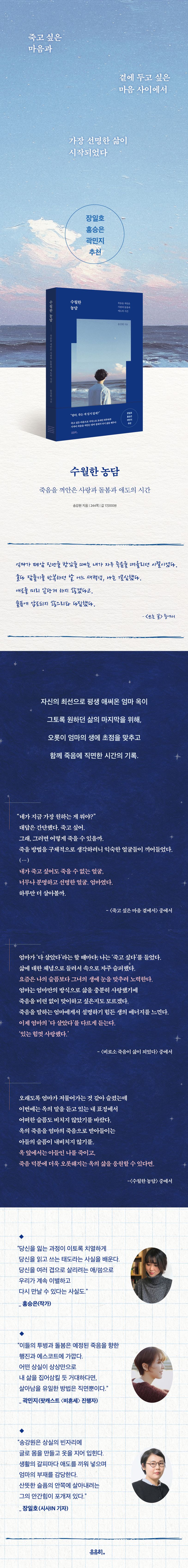 얼마 전까지 엄마에게 죽고 싶다고 고백하는 사람은 아들, 송강원이었다. 힘들다, 아프다를 건너뛰고 죽음을 함부로 입에 올릴 만큼 위태로운 나날이 계속되고 있었다. 삶의 우선순위를 바꿔 미국에서 한국으로, 단숨에 옥의 곁으로 오게 만든 건 5년 생존율 8.9퍼센트라는 숫자였다. 새벽 3시에야 편한 표정으로 잠든 옥의 곁에서, 병실을 비추는 온열램프의 빛에 기대어 조용히 마음을 적는다. 비로소 엄마 곁을, 당신의 돌봄을 허락해줘서 고맙다고. 그렇게 지난 3년간 꾸준히 써온 글이 『수월한 농담』(유유히 펴냄)이 되었다.
