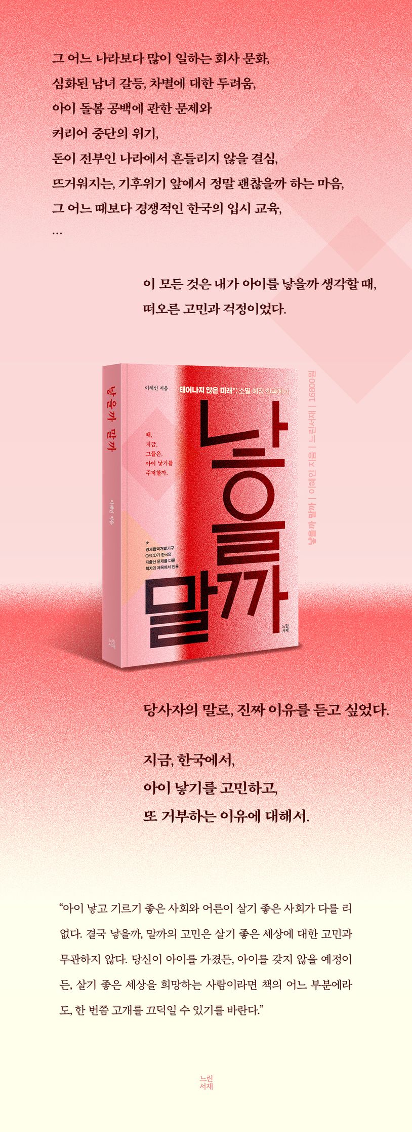이 책은 최저출산율의 나라 한국에서 90년대생 기혼 여성이, 직접 이야기하는 ‘낳을까 말까’에 대한 고민의 글이다. 결혼 8년 차, 내내 딩크로 살던 저자는 30대 중반이 되어 진지하게 아이 낳는 문제, “낳을까 말까”를 고민한다. 어느 날 문득 출산이, 30대의 마지막 숙제인가 하는 의문이 들었기 때문이다. 그러나 왜, ‘한국’이라는 나라는 기혼여성의 아이 낳는 선택을 매우 어렵게 만드는 걸까. 쉽게 답을 적을 수 없는-아이를 낳을까 말까와 관련된 열여섯 가지의 질문과 답을 2년 동안 정리해 보았다.