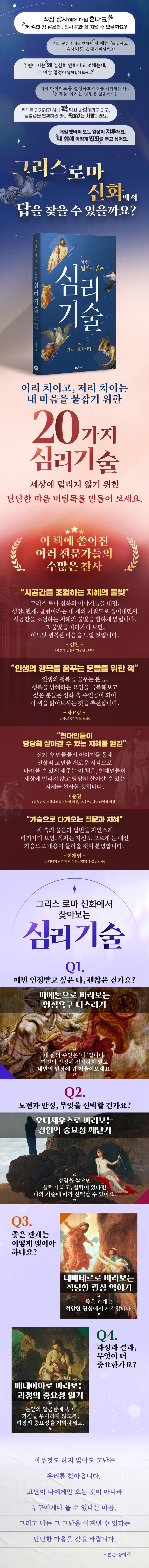 들어가는말그리스로마신화길라잡이첫번째이야기,내면*매번인정받고싶은나,괜찮은건가요?_파에톤*피할수없는운명,받아들여야할까요?_오이디푸스*참을수없는유혹,어떻게하면좋을까요?_오디세우스*직장생활에회의감이듭니다_시시포스*나도모르게꼰대가되었습니다)크로노스두번째이야기,성장*겸손하면성공한다.과연맞을까요?_아라크네*당신의멘토는누구인가요?_텔레마코스,아네테*노력은배신하지않을까요?_헤파이스토스*도전과안정,무엇을선택할건가요?_오디세우스*당신의열정은남아있나요?_제우스세번째이야기,관계*좋은관계,적당한관심에서시작합니다_페르세포네*협업이필요한가요?_제우스*약속은모두지켜야하나요?_스틱스*주변에쓴소리하는사람이있나요?_카산드라*직장상사와잘지낼수있을까요?_프로메테우스네번째이야기,균형*내삶에변화를주고싶어요_카오스,코스모스*단순한희망은절망의시작입니다_판도라*원칙과융통성,무엇이더중요할까요?_프로크루스테스*과정과결과,무엇이더중요한가요?_메데이아*시작보다끝이더중요합니다_벨레로폰그리스로마신화와함께하는별자리이야기그리스로마신화와함께하는브랜드이야기