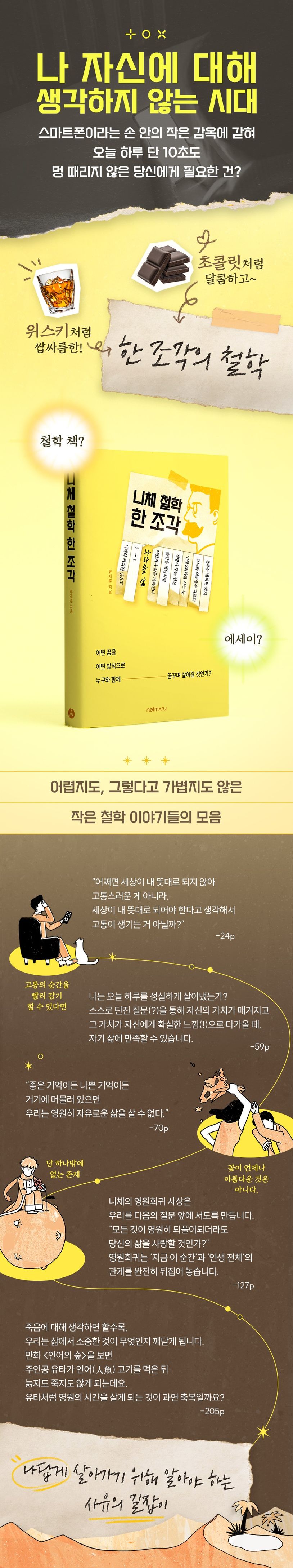 니체의 철학은 어떤 일이든 잘 될 거라고, 다 괜찮을 거라고 말하지 않는다. 때로는 따듯한 위로보다 오히려 담담함이 필요한 법이다. 작가는 니체 특유의 함축적이고 비유적인 잠언을 자신만의 틀에 비추어 어렵지 않게 술술 풀어내고 있다. 니체와 철학을 다루고 있으니 이 책은 철학 책이며, 작가가 우리에게 말을 걸고 있으므로 이 책은 에세이다. 철학과 에세이 그 중간 어디쯤, 어렵지도 가볍지도 않은 작은 이야기들이 모여 당신을 위한 사유의 길잡이가 되어줄 것이다.