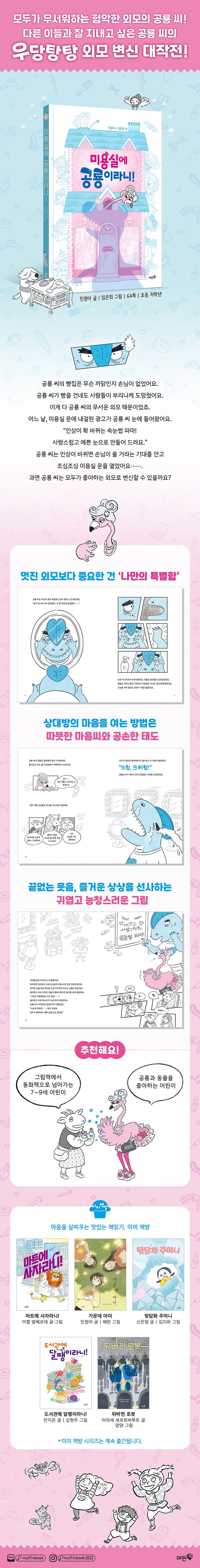 《미용실에 공룡이라니!》는 무서운 겉모습 때문에 외롭게 지내는 공룡 씨의 변신 대작전을 유쾌하게 담은 이야기입니다. 공룡 씨는 자신의 외모가 누군가 정해 놓은 ‘아름다움’의 기준에 한참 못 미치는, 오답이라고 여겨요. 그래서 모두가 좋아할 만한 외모를 갖기 위해 미용사 플라밍고 씨에게 도움을 청하지요. 하지만 플라밍고 씨의 손길이 닿을 때마다 공룡 씨는 호감도가 올라가기는커녕 점점 이상한 모습으로 변해 갑니다.