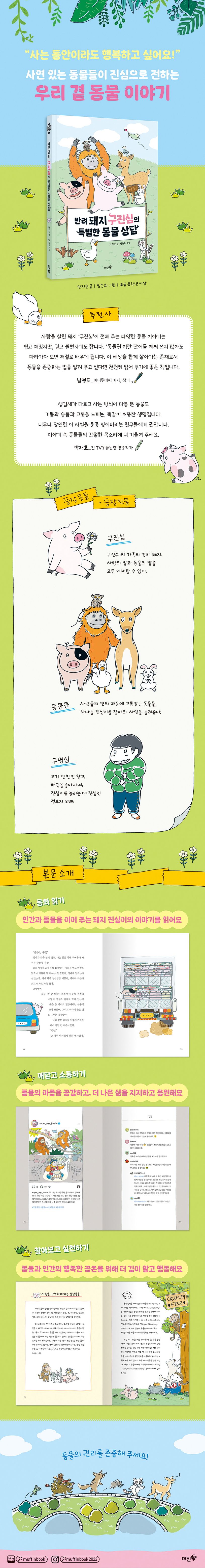 《반려 돼지 구진심의 특별한 동물 상담》은 눈에 직접 보이지 않아 잘 와 닿지 않는 동물권의 현실을 담은 동화예요. 쓰러진 엄마를 구해 일약 슈퍼스타가 된 반려 돼지 ‘구진심’의 목소리(SNS)를 통해 사람들의 이기심 때문에 고통받는 동물들의 현실을 어린이 눈높이에 맞게 들려주어요. 이 이야기는 인간이 동물들 덕분에 살고 있다는 것, 동물도 존중받아야 할 귀한 생명이라는 것, 그래서 동물의 삶을 함부로 훼손해선 안 된다는 것을 알려 주고 우리가 할 수 있는 작은 실천을 골똘히 생각해 보는 시간을 선사합니다.