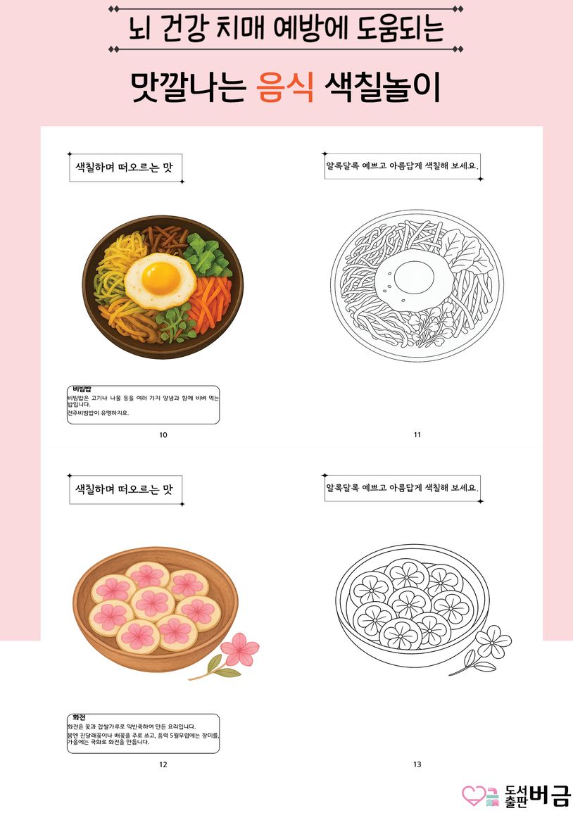 뇌건강을지켜주는컬러링북색으로마음을치유한다는말을들어본적이있으실겁니다.우리에게색이주는효과는의외로많은데,이처럼색으로마음을치유하는방법을‘컬러테라피’라고합니다.‘색(Color)’과‘테라피(Therapy)’의합성어인컬러테라피는색의에너지와성질을심리치료에활용하여스트레스를완화시키는등의효과를얻을수있는심리요법입니다.《맛깔나는음식색칠놀이》는섬세한밑그림에다양한색을입힐수있게구성하였는데,오로지색칠하는데만몰입하게되어스트레스를잠시잊고평온한상태가되도록도움을줄것입니다.또한어떤색을칠하느냐에따라결과물이달라지므로,자신만의노력과감정으로하나의작품이완성되기때문에창의성과성취감을얻게될것입니다.매일이처럼다양한색으로책을채워나가면서정신의활력을얻을수있는것이컬러링북의가장큰장점입니다.전문가들은컬러링북에색을칠하며몰입하는활동만으로도명상과유사한효과가있다고말했을정도로그효과가입증되고있습니다.중년층이상에서는치매예방의효과까지기대해볼수있습니다.《맛깔나는음식색칠놀이》를통해건강한뇌를지키면서무서운병인‘치매’도예방하고삶이향기로워지길바랍니다.*인증유형:공급자적합성확인