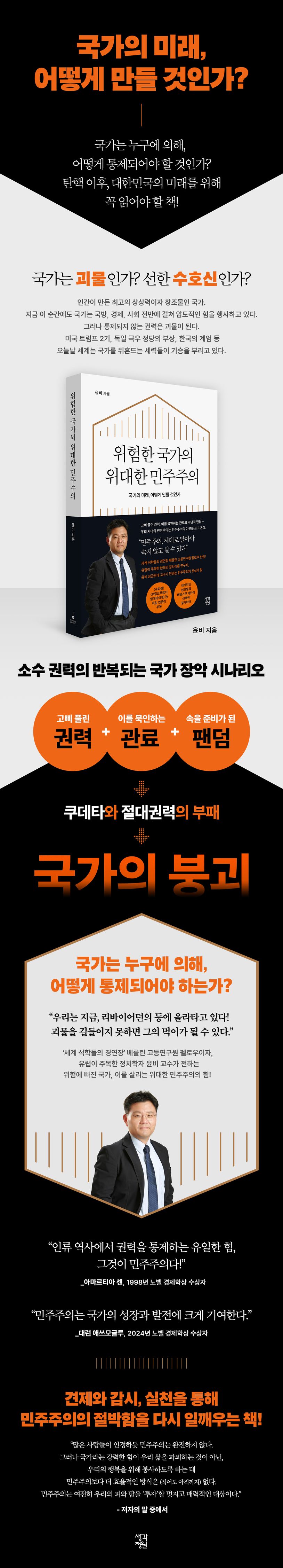 이책《위험한국가의위대한민주주의》는막강한힘을가진‘국가’와그힘을통제하는‘민주주의’의탄생과성장,갈등과대결,그리고국가와민주주의가나아갈역할과방향을담고있다.국가는‘생존과안전’을위해인간이만든최고의창조물이며,오늘날의국가를대체할힘은존재하지않을만큼강력하다.그러기때문에국가권력을독점하려는세력이끊이질않는것이현실이다.역사는민주주의와헌법을무시하고국가를괴물로만든세력들을기록해왔다.국민을무시한채거대양당이이익을독점하는베네수엘라,‘내편정치’가만들어낸유대인학살이라는최악의비극,관료의무소불위권력이초래한‘일본의잃어버린30년’등이대표적사례이다.또한칠레피노체트의군사쿠데타,프랑스루이나폴레옹의친위쿠데타처럼,폭력을통해권력을장악한사례들도여전히민주주의에대한경고로남아있다.
